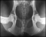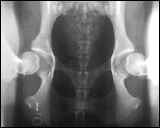 Die Hintergliedmaße des Patienten sind gestreckt. PennHIP nutzt diese Aufnahme, um Anzeichen einer Arthrose im Sinne einer degenerativen Gelenkserkrankung zu identifizieren. Traditionelle HD-Untersuchungen werden oftmals nur in dieser Position durchgeführt. Bei einem klassischen Verfahren würde dieser Patient gut abschneiden, da in der gestreckten Aufnahme kein Hinweis auf eine Arthrose oder auch Lockerheit der Hüfte zu finden ist. In der 1. Distraktions Aufnahme hingegen sieht man, dass die Hüfte nicht den straffen Eindruck vermittelt, den sie in der 3. gestreckten Aufnahme zu erwecken versucht. Die Hüfte ist "locker". Somit steigt die Gefahr einer Hüftgelenksdysplasie, in vielen Studien nachgewiesen, deutlich an. Dieser Hund wird mit großer Wahrscheinlichkeit in seinem weiteren Leben eine Arthrose im Bereich des Hüftgelenkes entwickeln. |